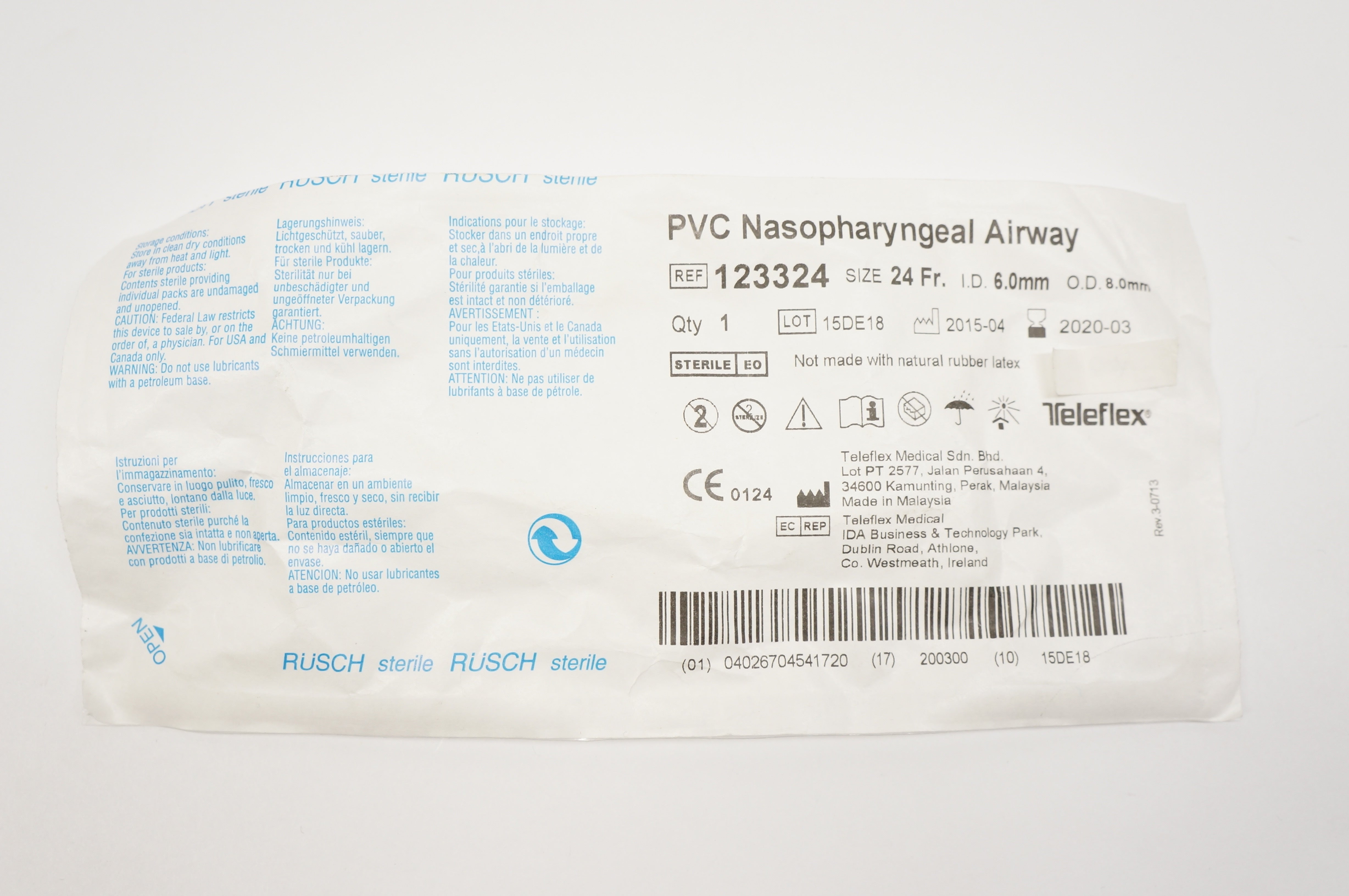 Teleflex 123324 PVC Nasopharyngeal Airway 24Fr. ID 6.0mm OD 8.0mm (x)