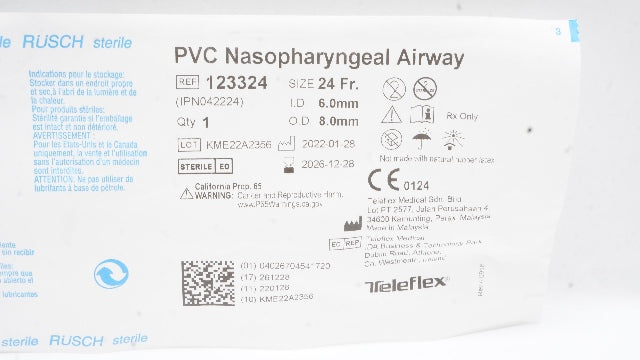 Teleflex 123324 Rusch PVC Nasopharyngeal Airway 24 Fr x 6.0mm ID x 8.0mm OD