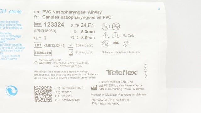 Teleflex 123324 Rusch PVC Nasopharyngeal Airway 24 Fr x 6.0mm ID x 8.0mm OD