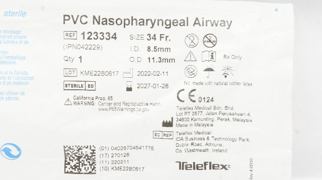 Teleflex 123334 PVC Nasopharyngeal Airway  34 Fr. 8.5mm x 11.3mm