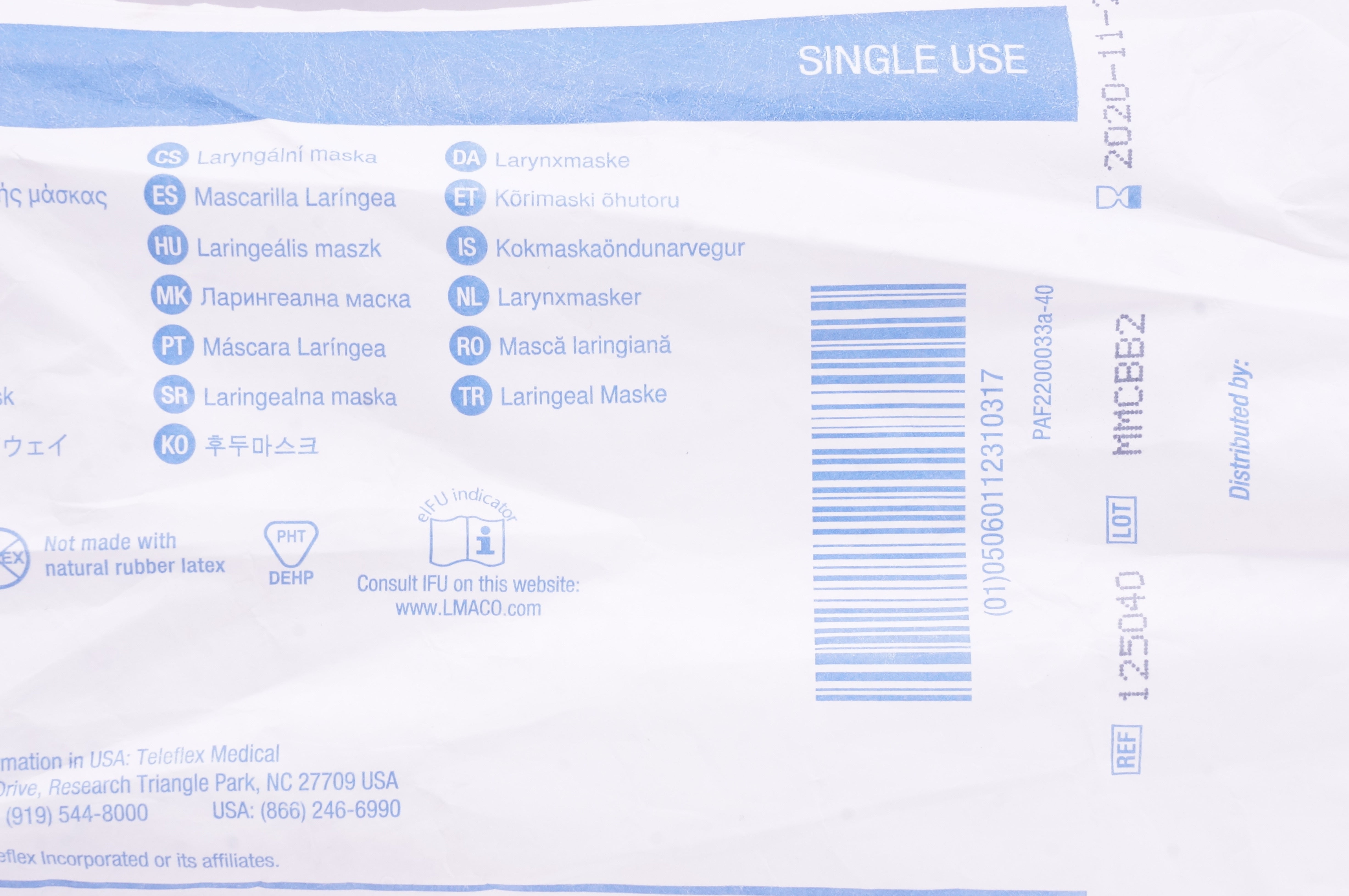 Teleflex 125040 LMA Unique Laryngeal Mask Airway Size 4, 50-70kg <30/60cm H2O(x)