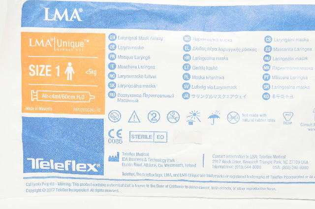 Teleflex 128010 LMA Laryngeal Mask Airway, Size 1 <5kg, Air<4ml/60cm H2O