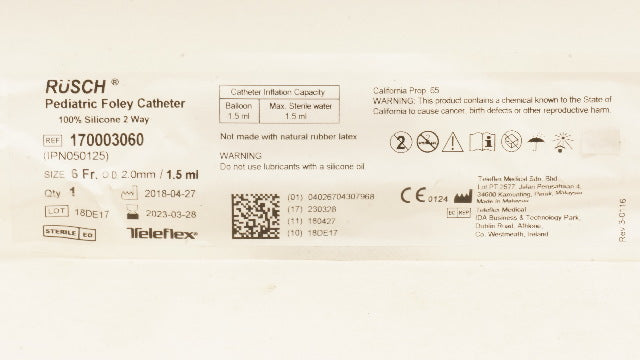 - Teleflex 170003060 RUSCH Pediatric Foley Cath. 6Fr x 2.0mm O.D. x 1.5ml
