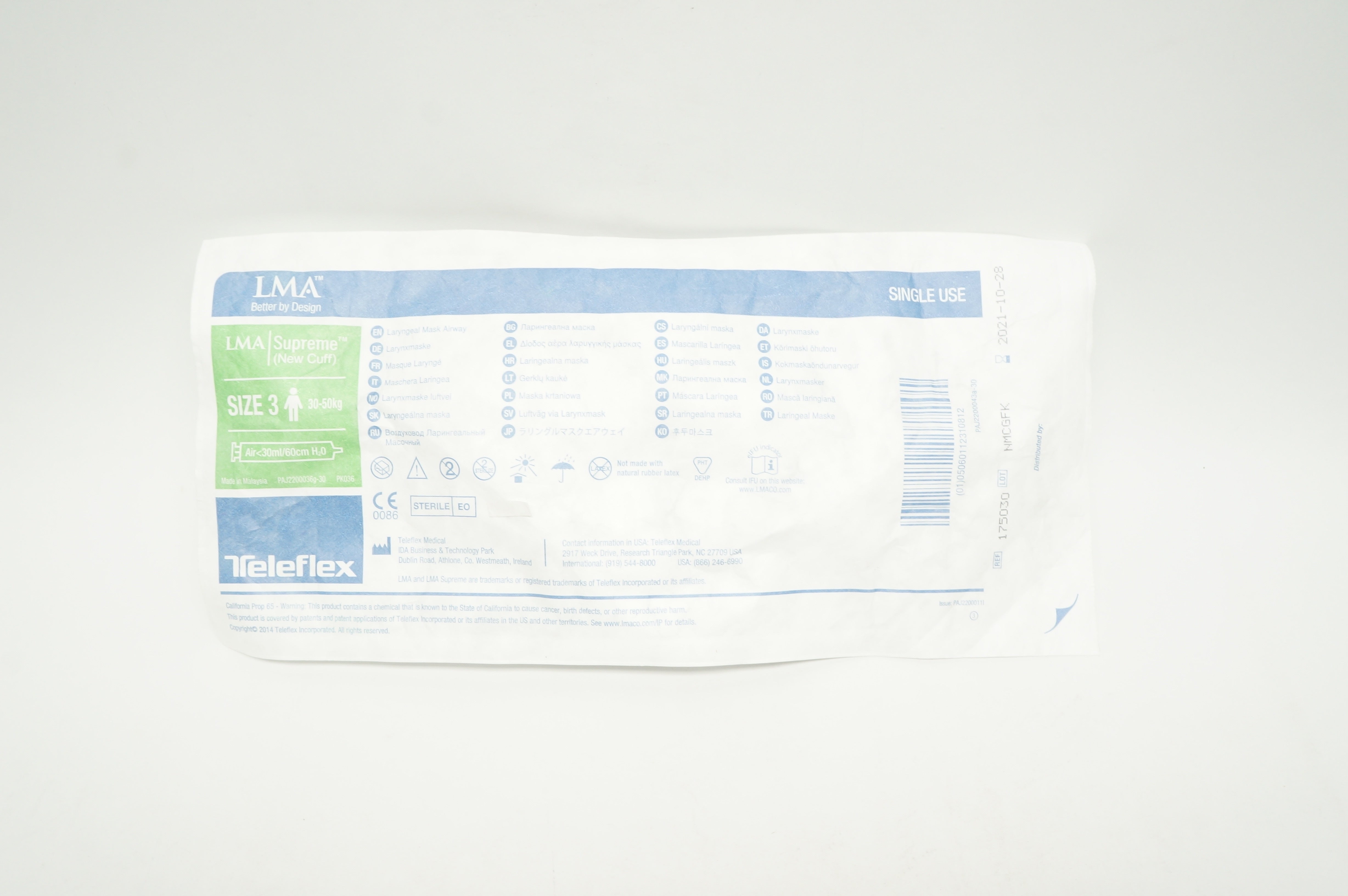 Teleflex 175030 LMA Supreme Laryngeal Mask Airway, Size 3 30-50kg, Air<30ml/60cm