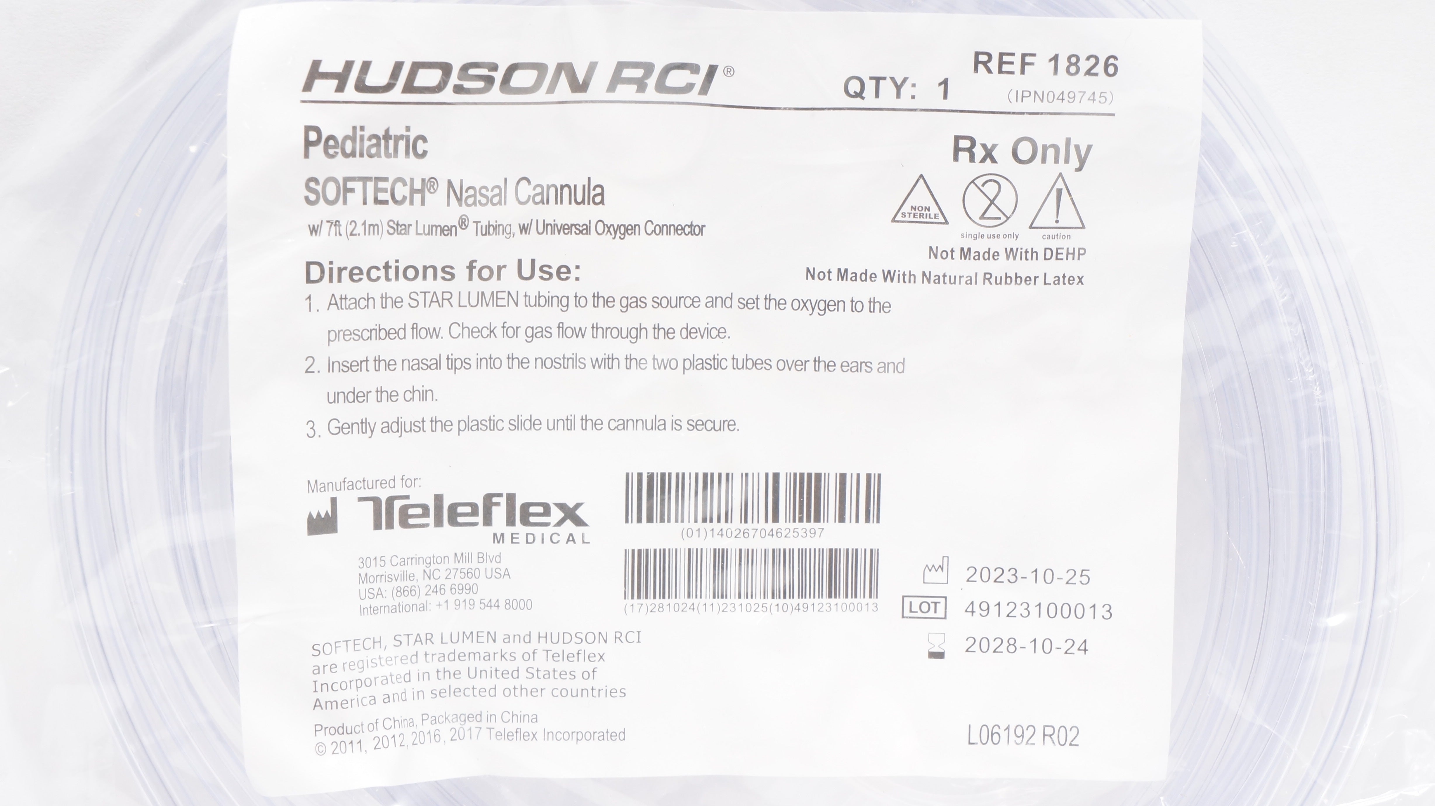 - Teleflex 1826 HudsonRCI Pediatric Softech Nasal Cannula w/7ftTubing&Connector