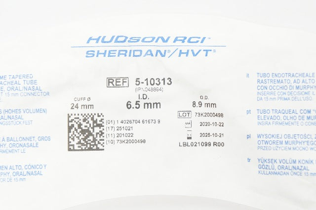 Teleflex 5-10313 HudsonRCI Sheridan HVT Cuffed Tracheal Tube 6.5IDx 8.9OD x 24mm