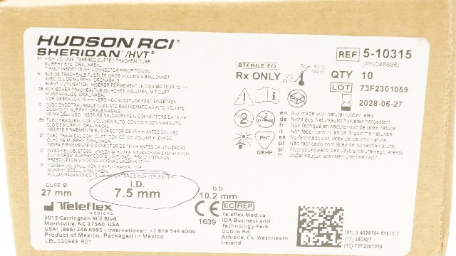 Teleflex 5-10315 Hudson RCI Sheridan HVT Cuffed Tracheal Tube 7.5 x 10.2 x 27mm