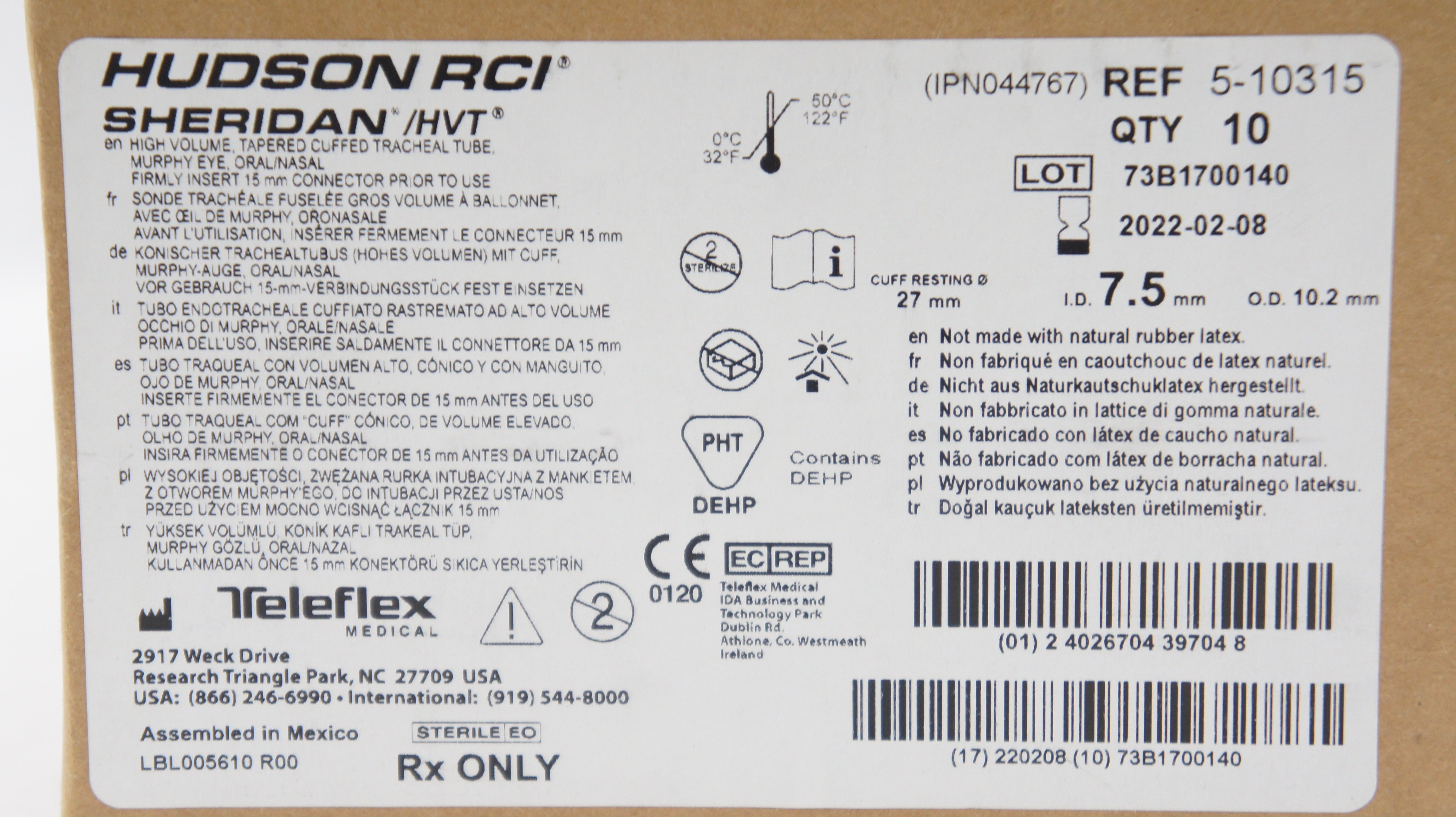 - Teleflex 5-10315 Hudson RCI Sheridan HVT Tracheal Tube 7.5x10.2mm (x) -Box of 10