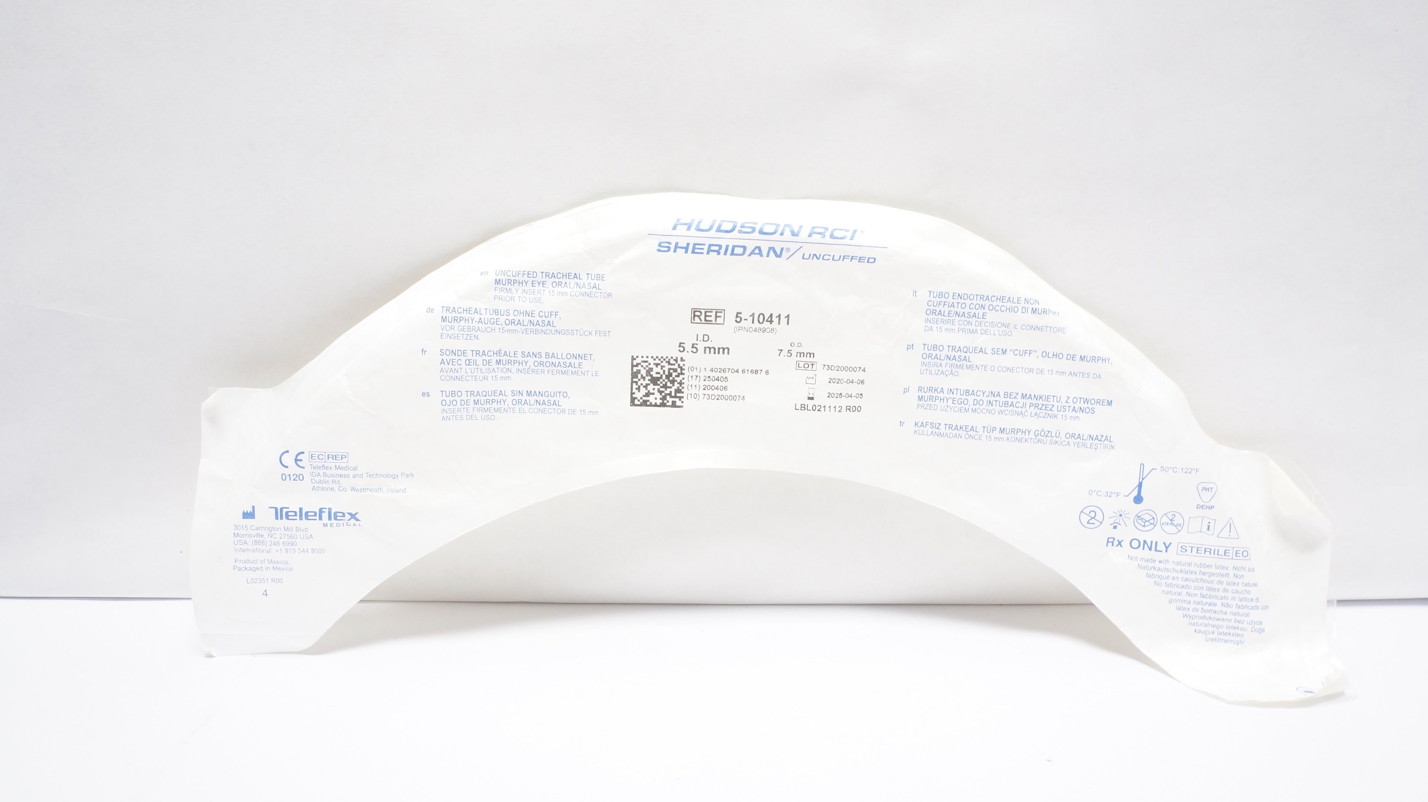 Teleflex 5-10411 Hudson RCI Uncuffed Tracheal Tube Oral/Nasal 5.5ID x 7.5mmOD(x)