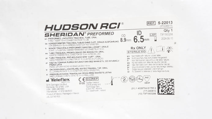 Teleflex 5-22013 Hudson RCI Sheridan Tracheal Tube, Oral 8.9mm OD x 6.5mm ID (x)