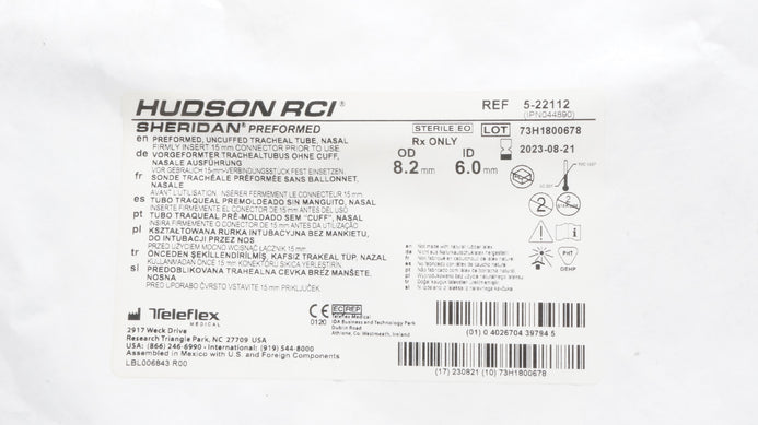 - Teleflex 5-22112 Hudson RCI Preformed Tracheal Tube 6.0mm ID x 8.2mm OD (x)