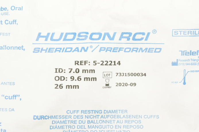 Teleflex 5-22214 Hudson RCI Sheridan Preformed, Cuffed Tracheal Tube Oral CRD 26mm OD 9.6mm ID 7.0mm
