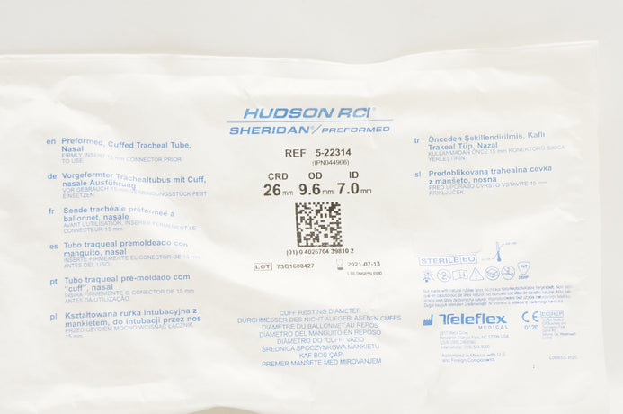 Teleflex 5-22314 Hudson RCI Sheridan Preformed, Cuffed Tracheal Tube Nasal CRD 26mm OD 9.6mm ID 7.0mm