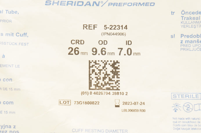 Teleflex 5-22314 Hudson RCI Sheridan Preformed, Cuffed Tracheal Tube Nasal CRD 26mm OD 9.6mm ID 7.0mm