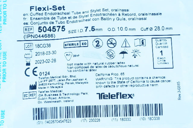 Teleflex 504575 Flexi-Set Endotracheal Tube & Stylet 7.5 ID x 10.0mm OD x 28.0mm