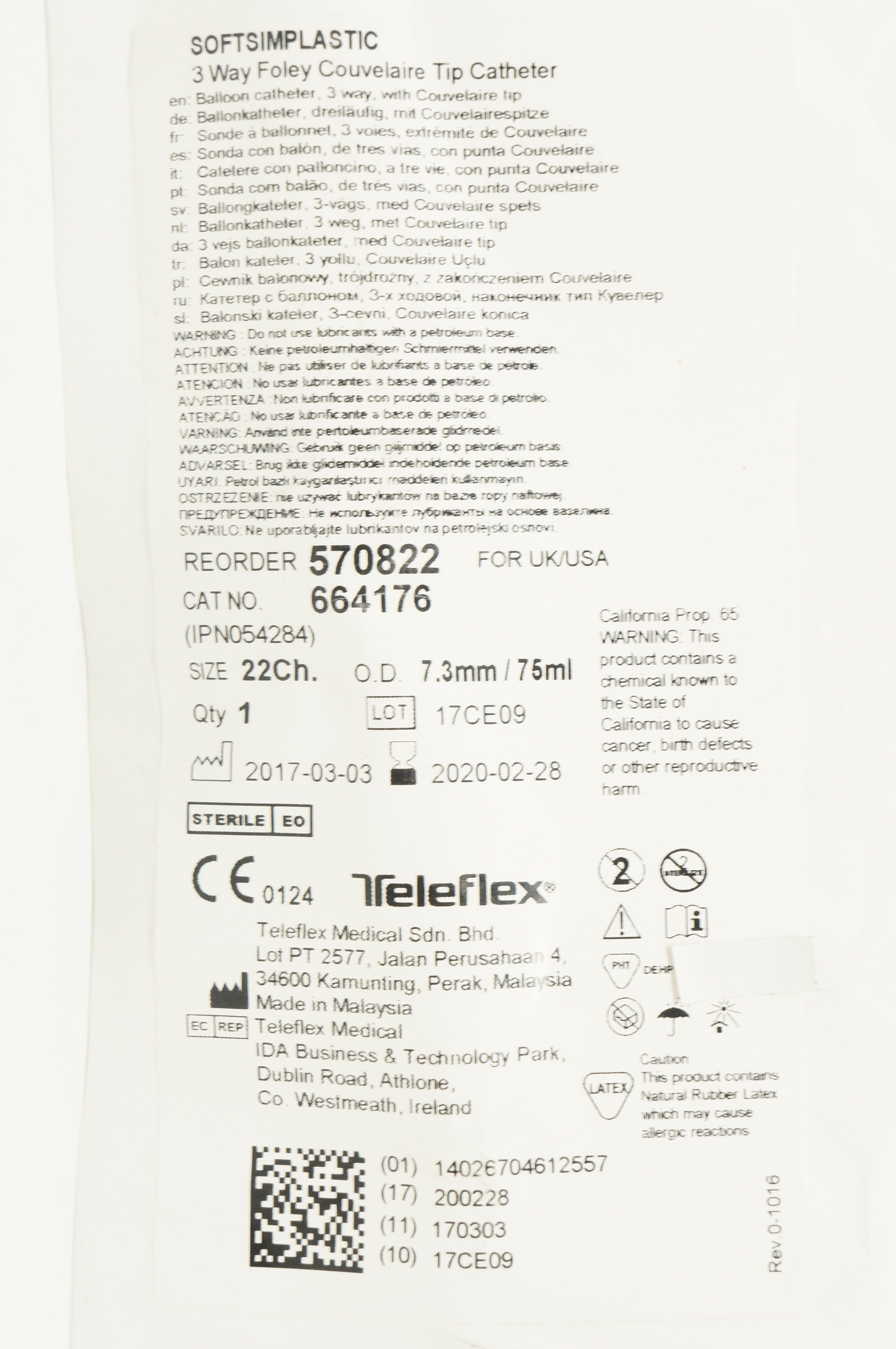 - Teleflex 664176 Softsimplastic 3 Way Couvelaire Tip Cath. 22Ch x 7.3mm x 75ml(x)