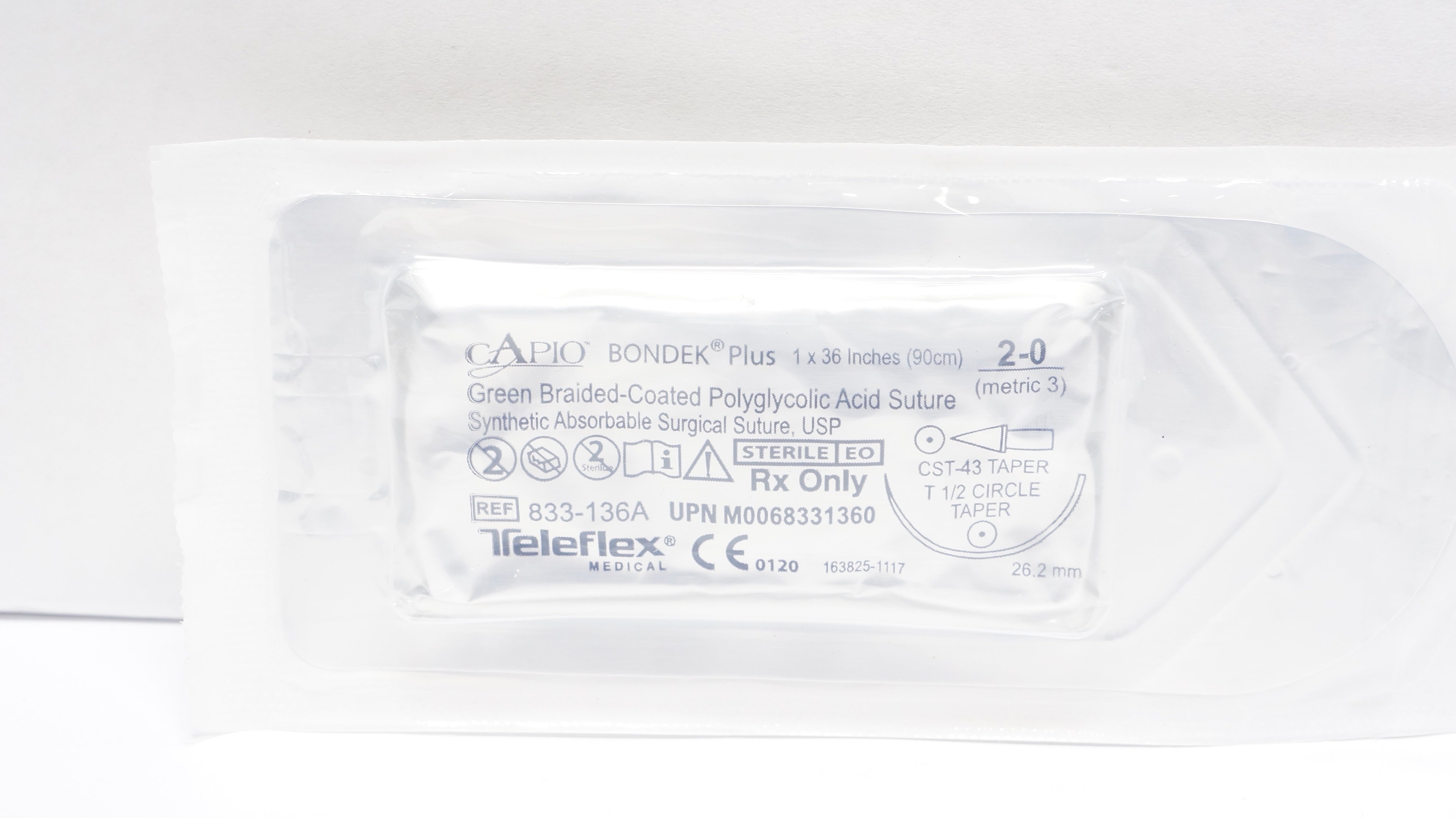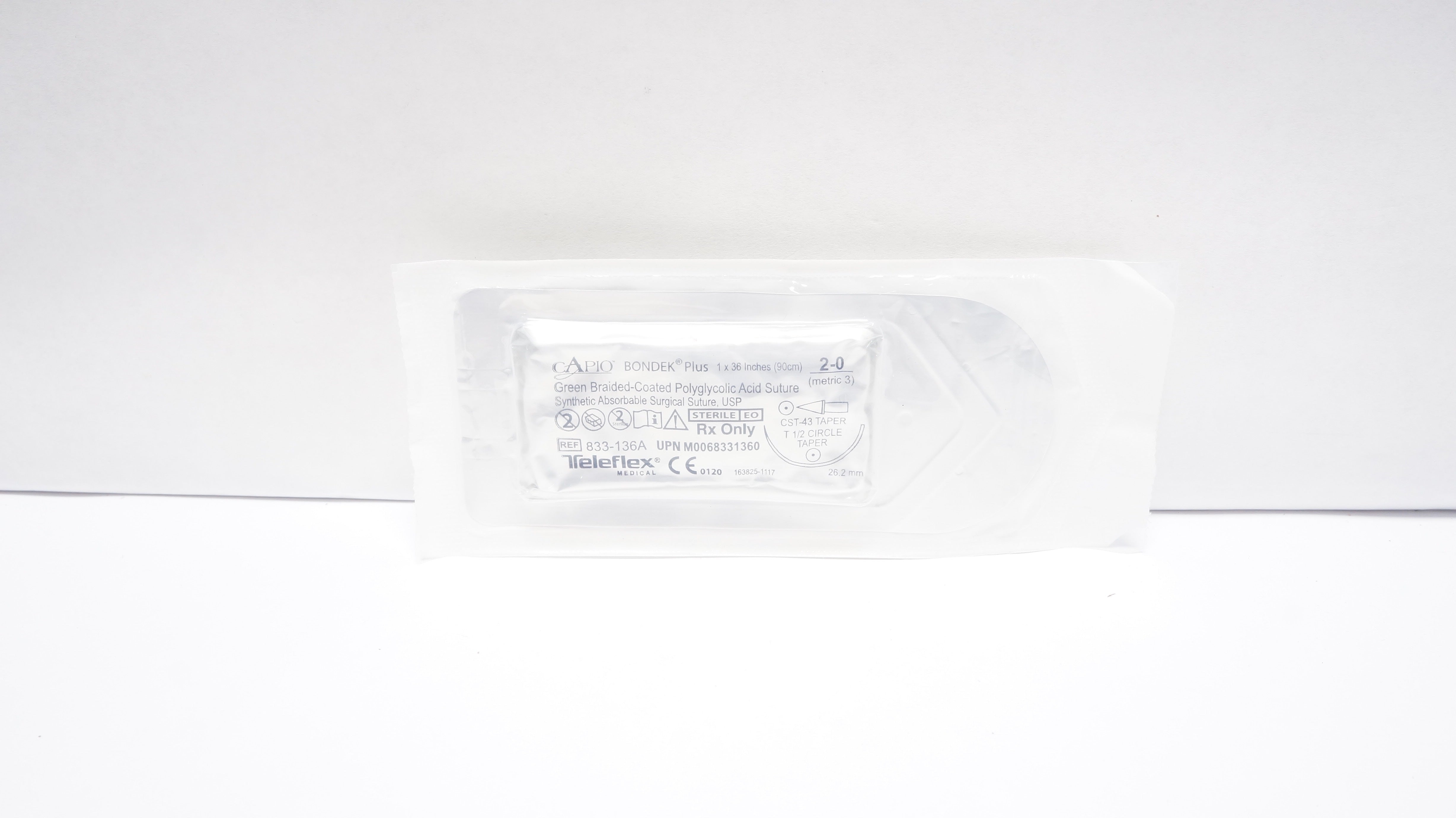Teleflex 833-136A 2-0 cApio Bondek Plus Green Braided-Coated Polyglycolic Acid Suture CST-43 Taper T 1/2c Taper 26.2mm 1x36inch