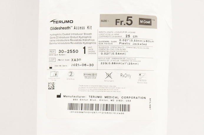 Terumo 30-2550 Glidesheath Access Kit, 5F, ID 0.074", Tip ID 0.068", 25cm, GW 0.021"x80cm, 22Ga Needle. Includes GlideSheath, IV Cath, Dilator, 2.5mL Syringe