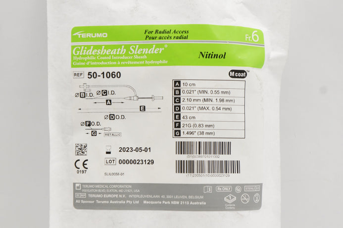 - Terumo 50-1060 Glidesheath Slender Hydrophilic Coated Nitinol Kit 6Fr