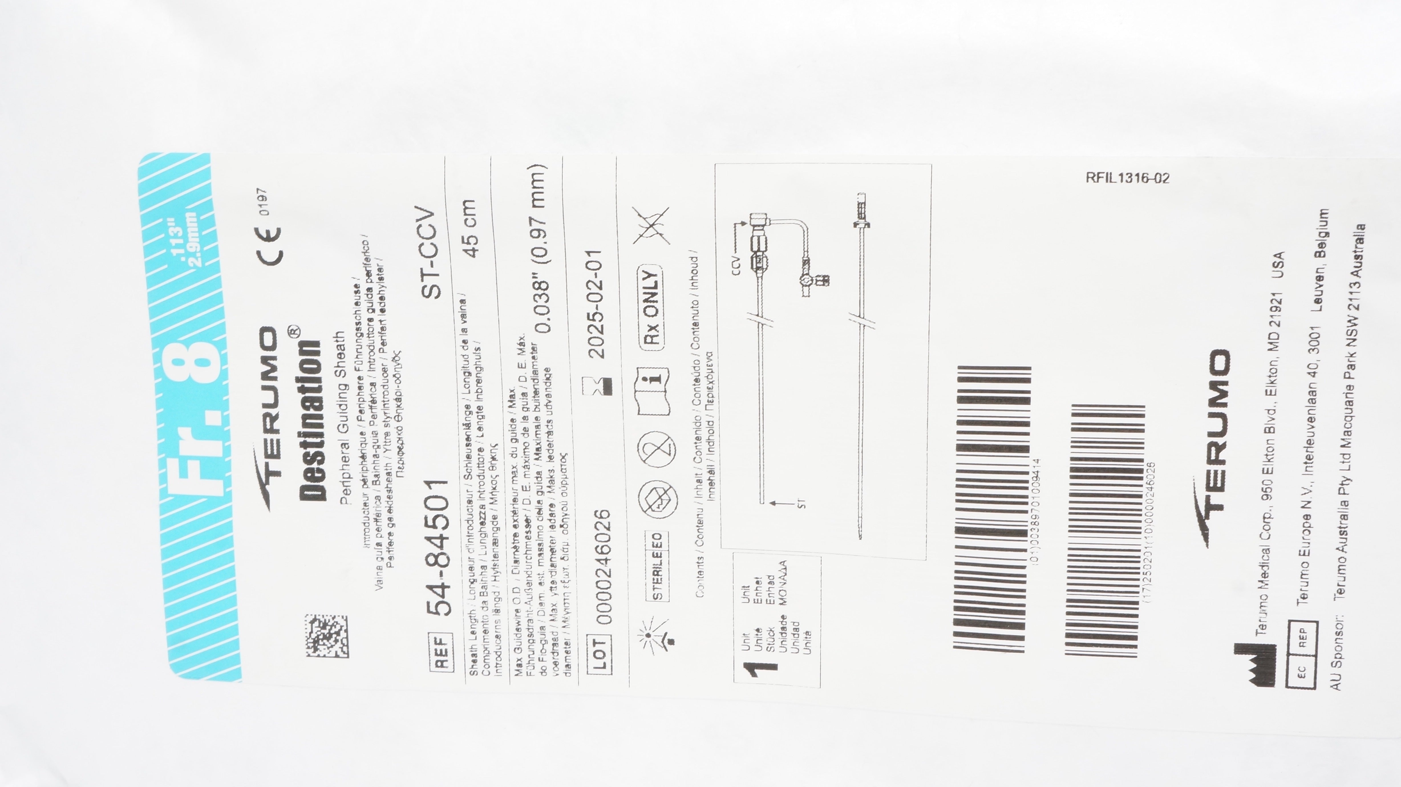 Terumo 54-84501 Destination Peripheral Guiding Sheath 8Fr x 45cm x 0.038inch
