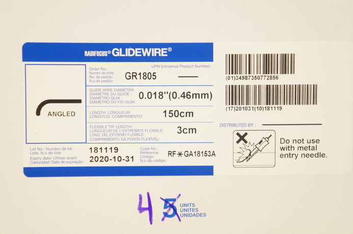 - Terumo GR1805 Radifocus Glidewire Radiopaque Angled 0.018inx150cmx3cm-Box of4(x)