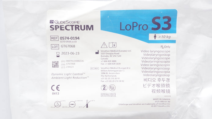 Verathon 0574-0194 GlideScope Spectrum Video Laryngoscope LoPro S3 >10 kg