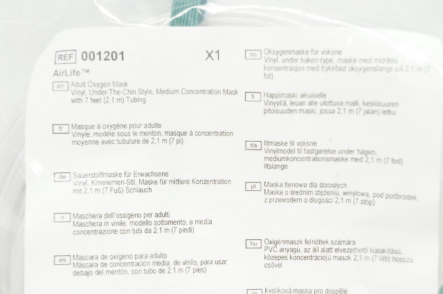 Vyaire 001201 AirLife Adult Oxygen Mask Vinyl, Under-The-Chin Style, Medium Concentration Mask with 7ft. Tubing