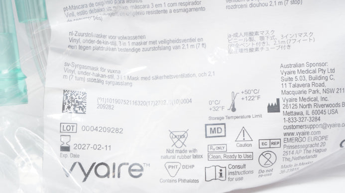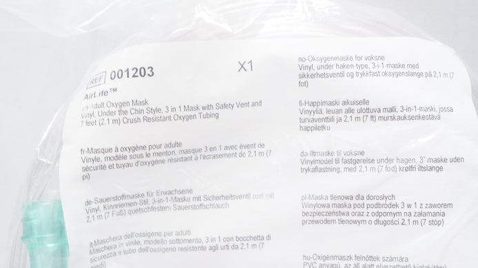- Vyaire 001203 AirLife Adult Oxygen Mask Vinyl w/Resistant Oxygen Tubing 7ft.