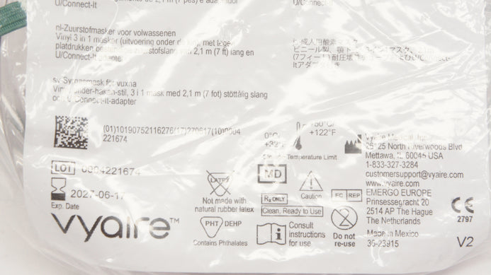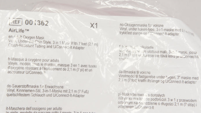 - Vyaire 001362 AirLife Adult Oxygen Mask Vinyl w/7ft. Tubing & U/Connect Adapter