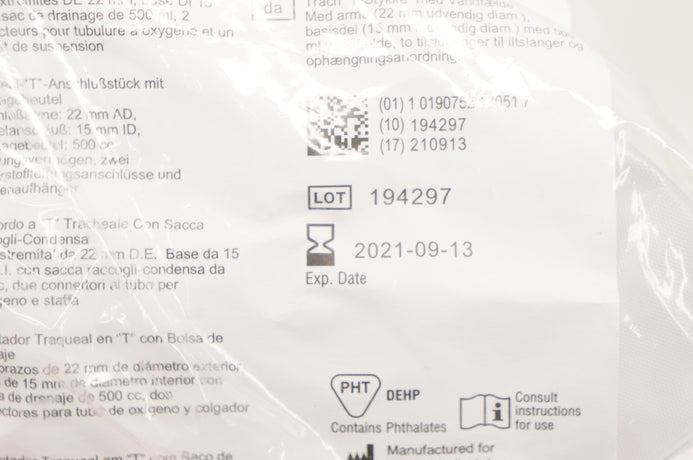 Vyaire 001501 AirLife Trach "T" Adapter with Drainage Bag with 22mm OD Arms, 15mm ID Base With 500cc