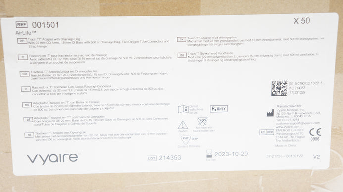 Vyaire 001501 AirLife Trach T Adapter with Drainage Bag 500cc (x) - Box of 50