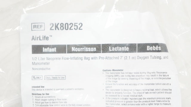 Vyaire 2K80252 AirLife 1/2L Neoprene Flow-Inflating Bag W/Oxygen Tubing 7Ft