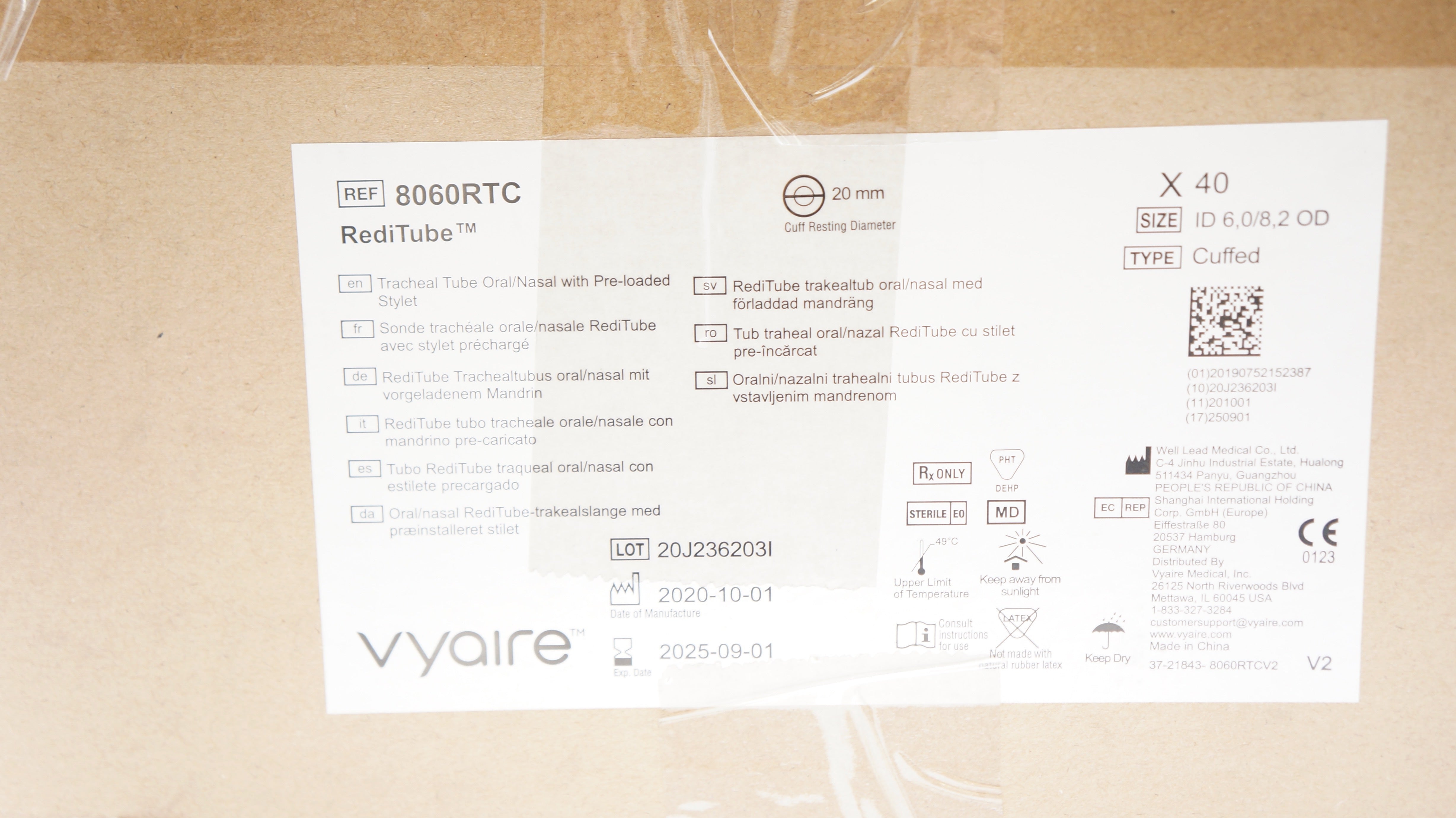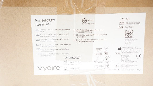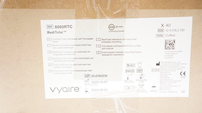 - Vyaire 8060RTC RediTube Oral/Nasal Cuffed Tracheal Tube 6.0x8.2mmx20mm-Box of 40