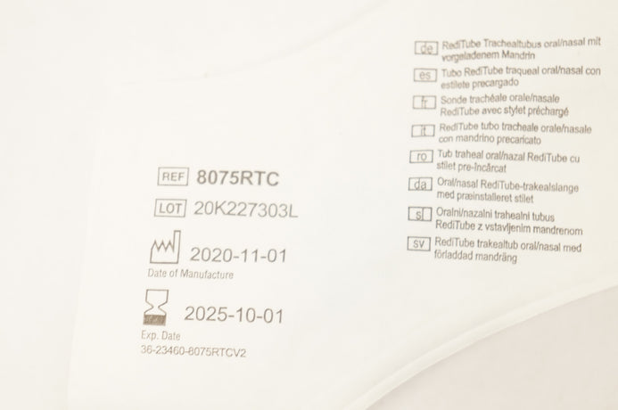 Vyaire 8075RTC RediTube Tracheal Tube Oral/Nasal with Preloaded Stylet Cuffed 7.5mm ID x 10.2 mm OD x 25mm