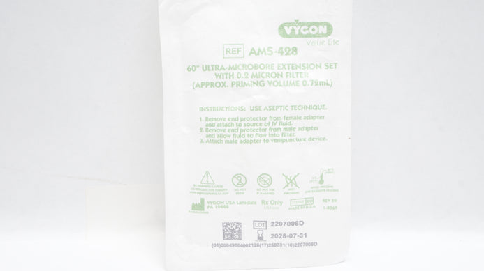 - Vygon AMS-428 Ultra-Microbore Extension Set w/0.2 Micron Filter, 60inch x 0.72mL