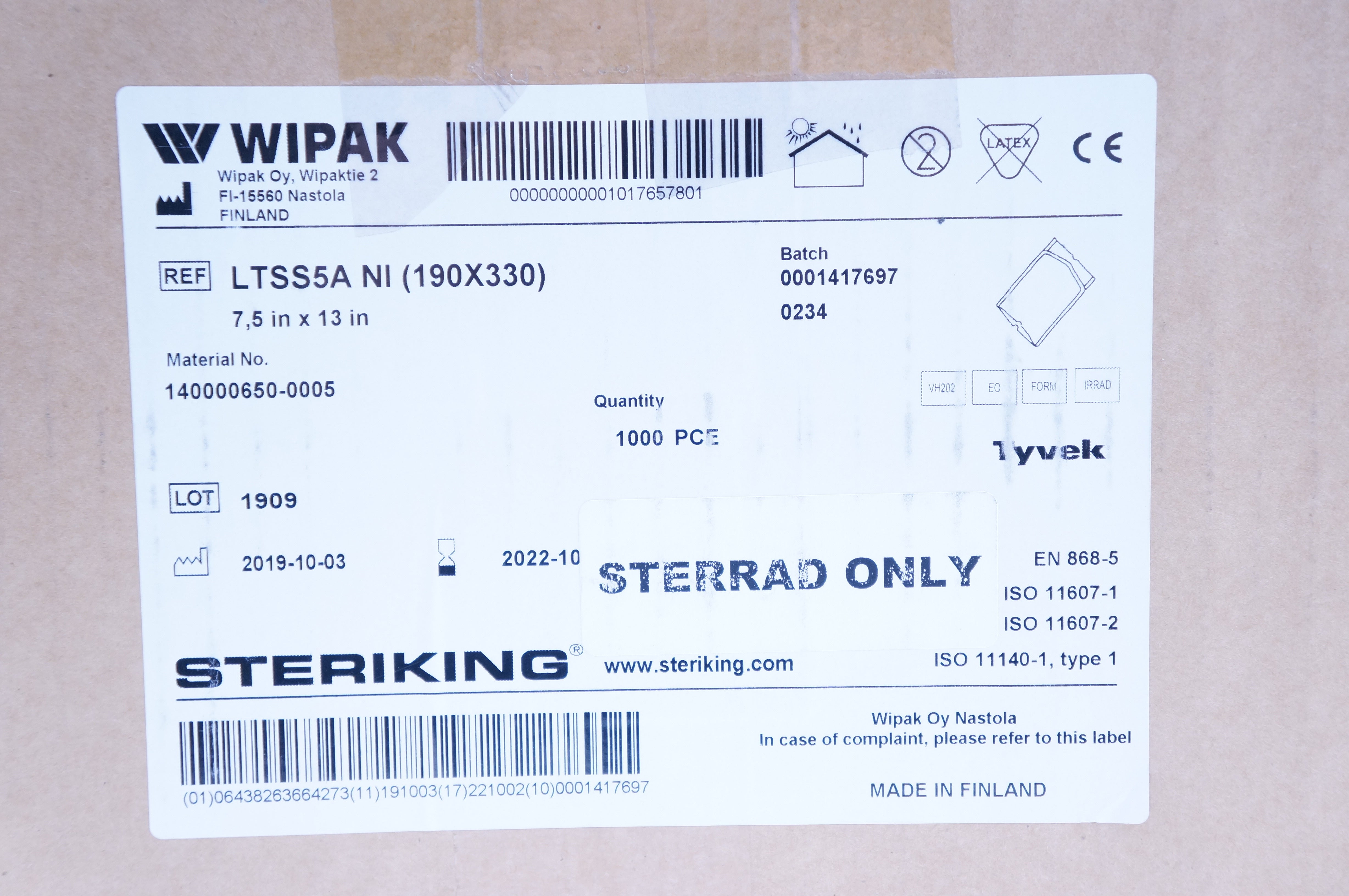 - Wipak LTSS5A Steriking LTSS Tyvek Sterilization Pouch 7.5in x 13in - Box of 1000
