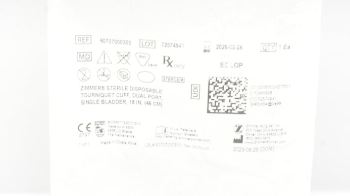 Zimmer 60707000300 Tourniquet Cuff, Dual Port, Single Bladder, 18in.