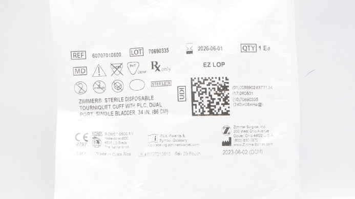 - Zimmer 60707010600 Sterile Disposable Tourniquet Cuff Dual Port, Bladder 34inch