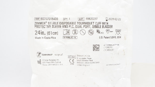 Zimmer 60707015400 Sterile Disposable Tourniquet Cuff w/ Protective Sleeve & PLC, Dual Port, Single Bladder, 24inch