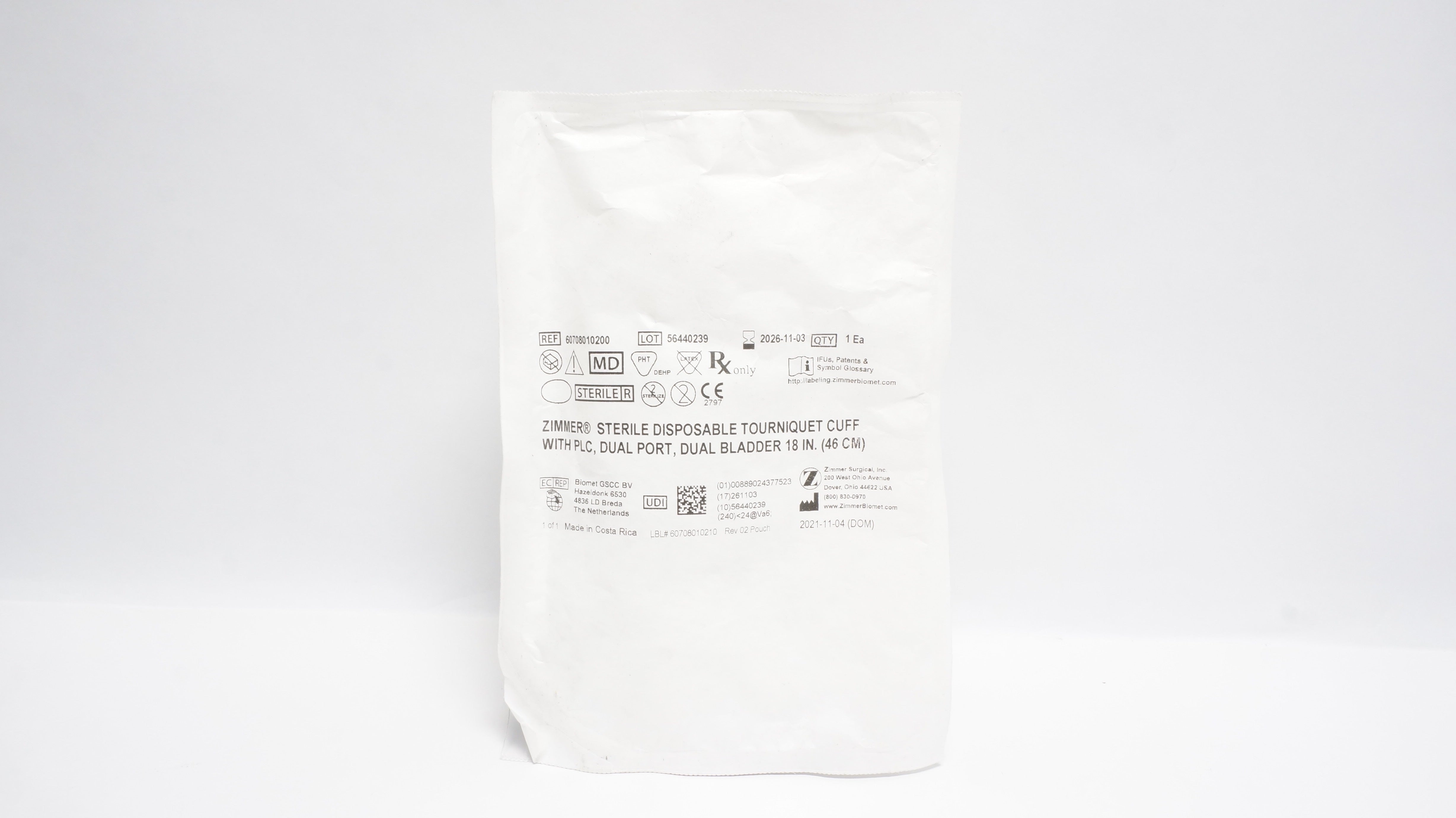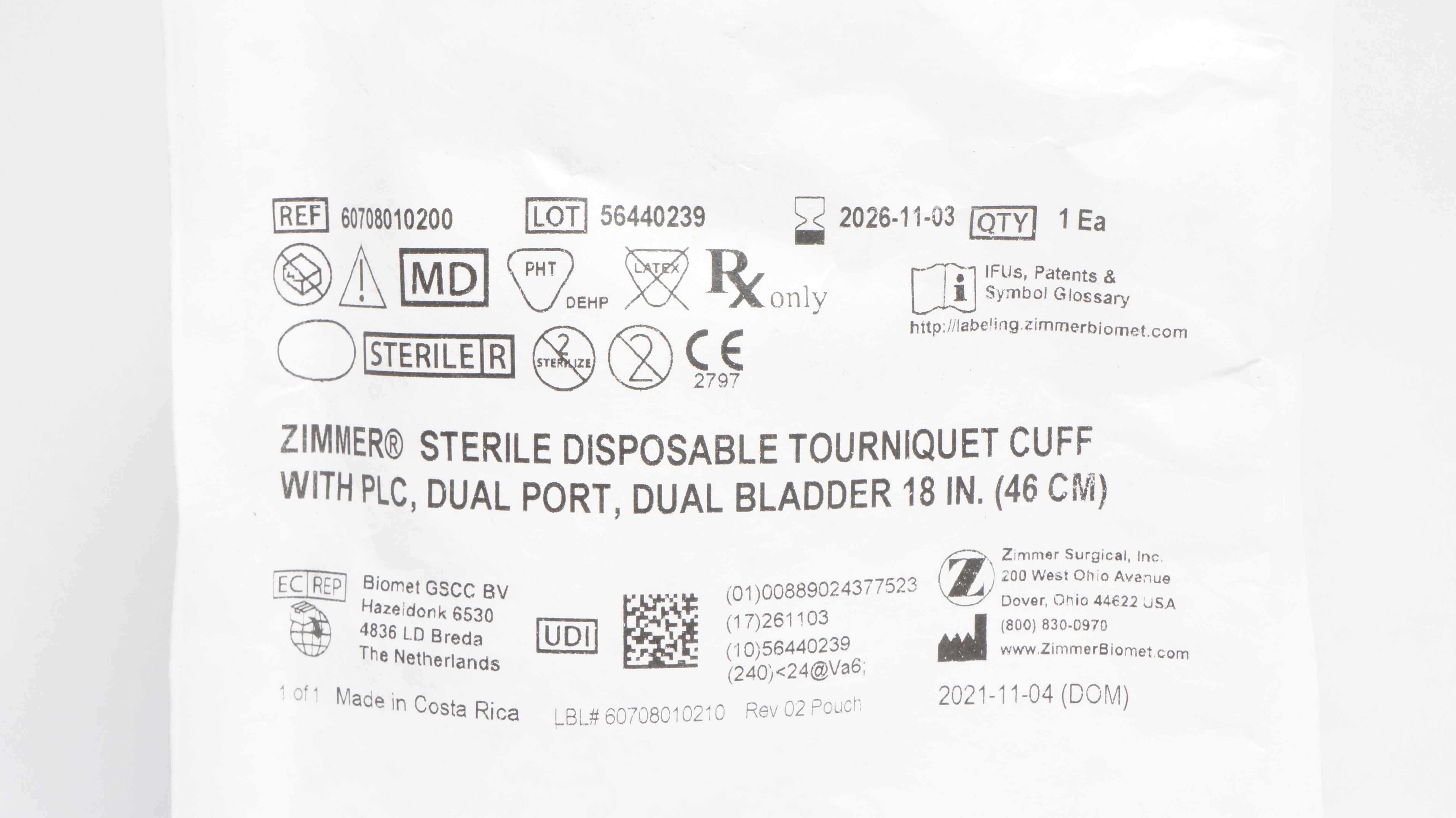 - Zimmer 60708010200 Tourniquet Cuff w/PLC, Dual Port, Dual Bladder 18inch